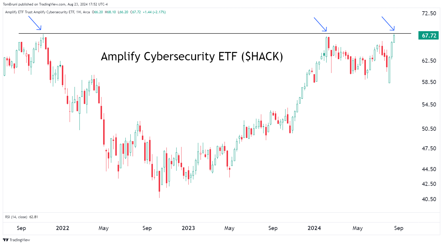 As a result, investors are also heavily focused on the sector, with many patiently waiting for industry-focused vehicles like ETF $HACK to break out to new all-time highs. The chart is testing resistance near $68 for the third time in four years, and many expect it to break out. 🤞