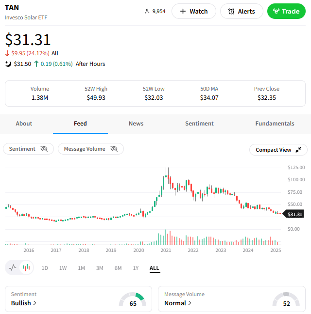 The news dragged down all solar energy stocks, with the ETF $TAN falling 3% to roughly 5-year lows on the day. Despite the plunge, Stocktwits sentiment remained in ‘bullish’ territory, though most acknowledge the sector as a contrarian bet given all the ‘obvious’ headwinds and an unclear upside catalyst. ⛈