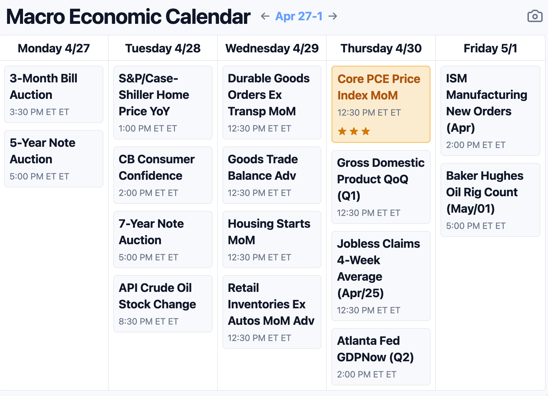 Thu: PCE Price Index (MoM/YoY/Core) (Mar) (8:30 AM ET), Initial + Continuing Jobless Claims (8:30 AM ET), Employment Cost Index (Q1) (8:30 AM ET), Chicago PMI (Apr) (9:45 AM ET)