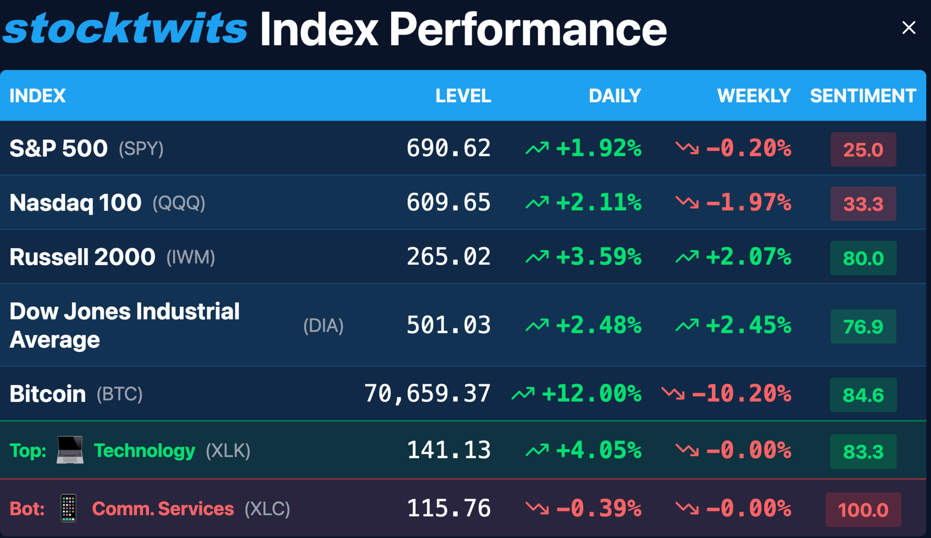 Securities Disclaimer: STOCKTWITS IS NOT A TAX ADVISOR, BROKER, FINANCIAL ADVISOR OR INVESTMENT ADVISOR. THE SERVICE IS NOT INTENDED TO PROVIDE TAX, LEGAL, FINANCIAL OR INVESTMENT ADVICE, AND NOTHING ON THE SERVICE SHOULD BE CONSTRUED AS AN OFFER TO SELL, A SOLICITATION OF AN OFFER TO BUY, OR A RECOMMENDATION FOR ANY SECURITY. Trading in such securities can result in immediate and substantial losses of the capital invested. You should only invest risk capital, and not capital required for other purposes. You alone are solely responsible for determining whether any investment, security or strategy, or any other product or service, is appropriate or suitable for you based on your investment objectives and personal and financial situation. You should also consult an attorney or tax professional regarding your specific legal or tax situation. The Content is to be used for informational and entertainment purposes only and the Service does not provide investment advice for any individual. Stocktwits, its affiliates and partners specifically disclaim any and all liability or loss arising out of any action taken in reliance on Content, including but not limited to market value or other loss on the sale or purchase of any company, property, product, service, security, instrument, or any other matter. You understand that an investment in any security is subject to a number of risks, and that discussions of any security published on the Service will not contain a list or description of relevant risk factors. In addition, please note that some of the stocks about which Content is published on the Service have a low market capitalization and/or insufficient public float. Such stocks are subject to more risk than stocks of larger companies, including greater volatility, lower liquidity and less publicly available information. Read the full terms & conditions here. 🔍